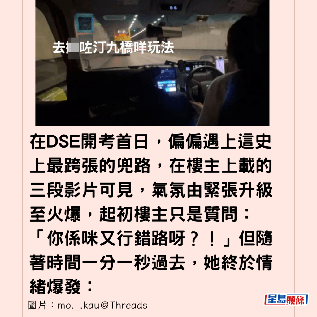 在DSE開考首日,偏偏遇上這史上最跨張的兜路,在樓主上載的三段影片可見,氣氛由緊張升級至火爆,起初樓主只是質問:「你係咪又行錯路呀?!」但隨著時間一分一秒過去,她終於情緒爆發: