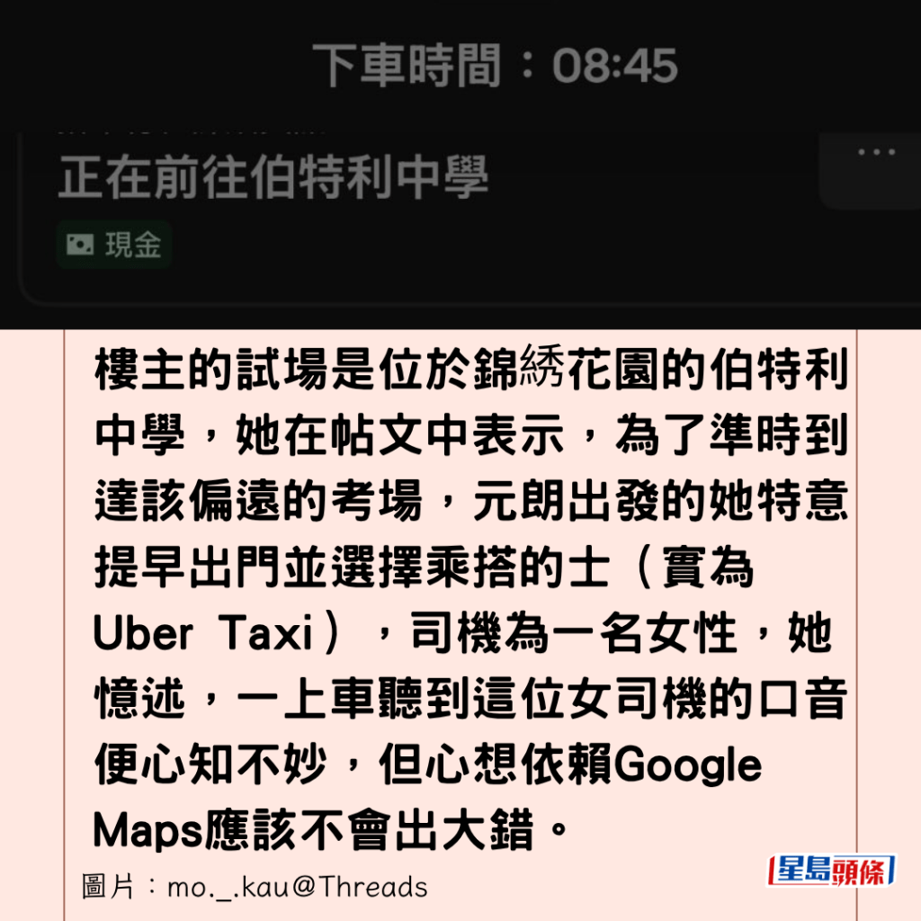 樓主的試場是位於錦綉花園的伯特利中學,她在帖文中表示,為了準時到達該偏遠的考場,元朗出發的她特意提早出門並選擇乘搭的士(實為Uber Taxi),司機為一名女性,她憶述,一上車聽到這位女司機的口音便心知不妙,但心想依賴Google Maps應該不會出大錯。