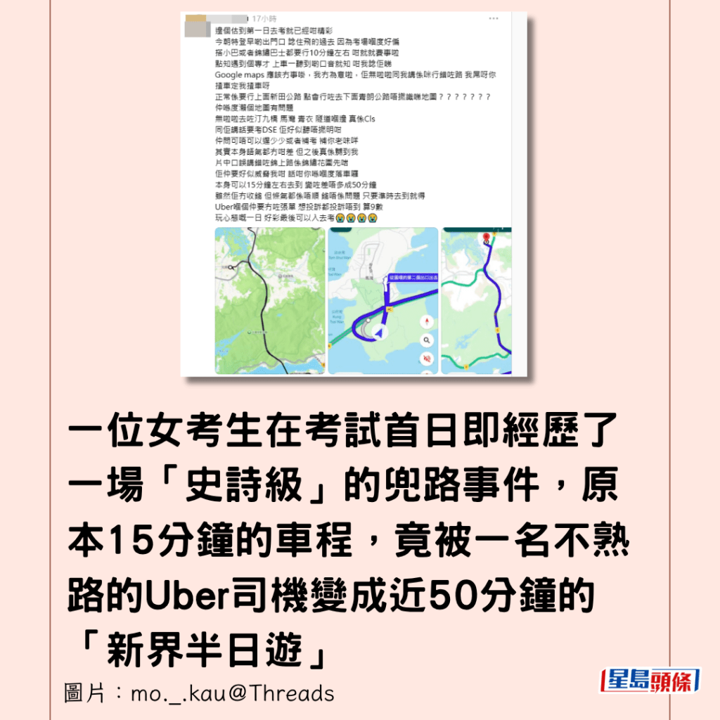 DSE(香港中學文憑考試)筆試昨日(8日)開考,萬千考生嚴陣以待,不過,一位女考生在考試首日即經歷了一場「史詩級」的兜路事件,原本15分鐘的車程,竟被一名不熟路的Uber司機變成近50分鐘的「新界半日遊」,途徑汀九橋、青衣,甚至殺入馬灣,令她險些遲到,過程驚心動魄,心情由憤怒變無奈。