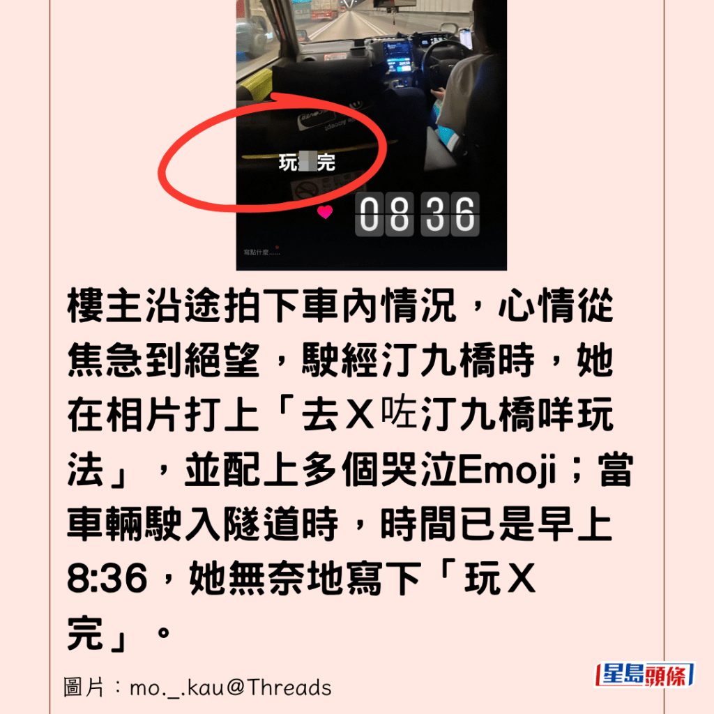 樓主沿途拍下車內情況,心情從焦急到絕望,駛經汀九橋時,她在相片打上「去X咗汀九橋咩玩法」,並配上多個哭泣Emoji;當車輛駛入隧道時,時間已是早上8:36,她無奈地寫下「玩X完」。