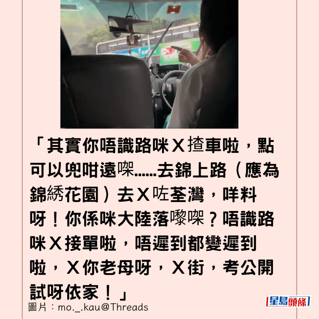 「其實你唔識路咪X揸車啦,點可以兜咁遠㗎……去錦上路(應為錦綉花園)去X咗荃灣,咩料呀!你係咪大陸落嚟㗎?唔識路咪X接單啦,唔遲到都變遲到啦,X你老母呀,X街,考公開試呀依家!」