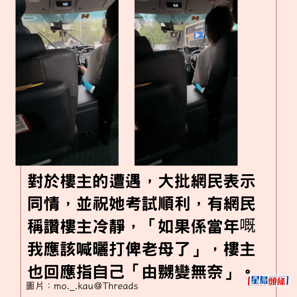 對於樓主的遭遇,大批網民表示同情,並祝她考試順利,有網民稱讚樓主冷靜,「如果係當年嘅我應該喊曬打俾老母了」,樓主也回應指自己「由嬲變無奈」。