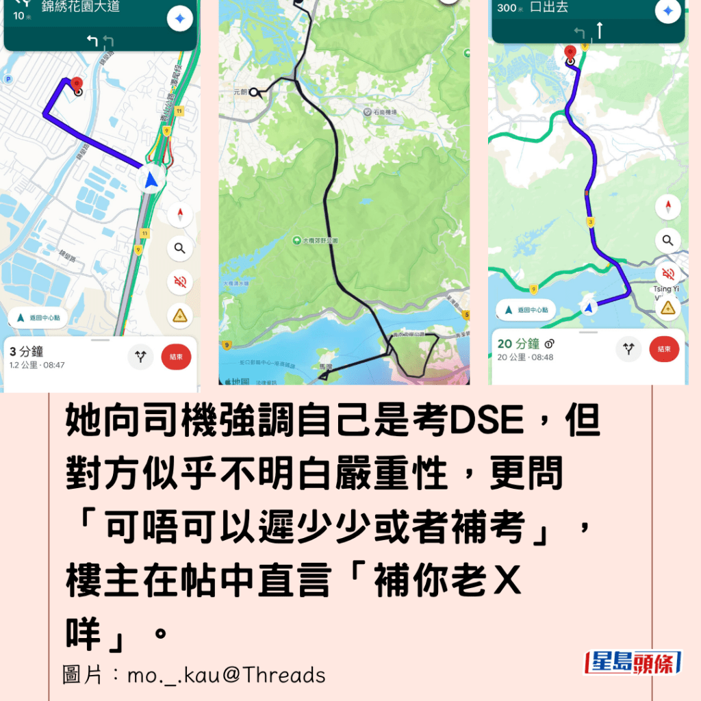 她向司機強調自己是考DSE,但對方似乎不明白嚴重性,更問「可唔可以遲少少或者補考」,樓主在帖中直言「補你老X咩」。