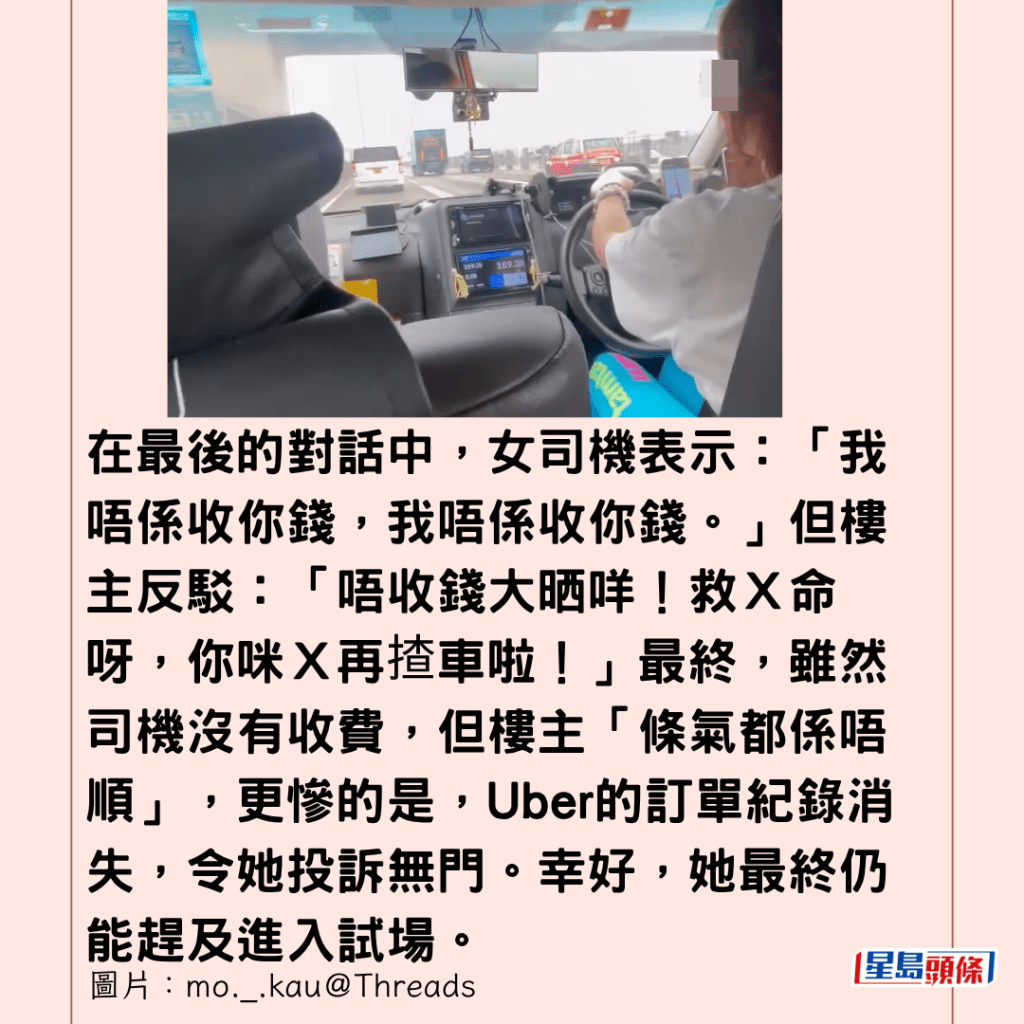 在最後的對話中,女司機表示:「我唔係收你錢,我唔係收你錢。」但樓主反駁:「唔收錢大晒咩!救X命呀,你咪X再揸車啦!」最終,雖然司機沒有收費,但樓主「條氣都係唔順」,更慘的是,Uber的訂單紀錄消失,令她投訴無門。幸好,她最終仍能趕及進入試場。