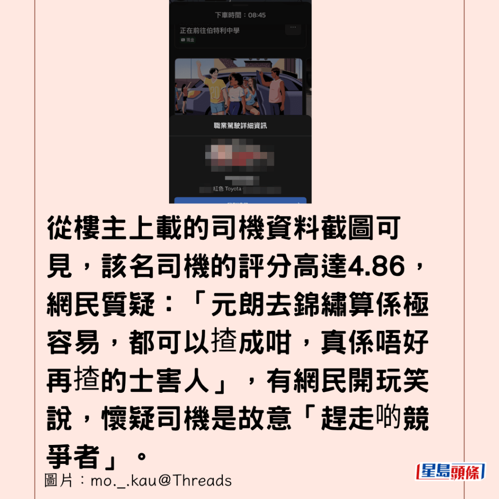從樓主上載的司機資料截圖可見,該名司機的評分高達4.86,網民質疑:「元朗去錦繡算係極容易,都可以揸成咁,真係唔好再揸的士害人」,有網民開玩笑說,懷疑司機是故意「趕走啲競爭者」。