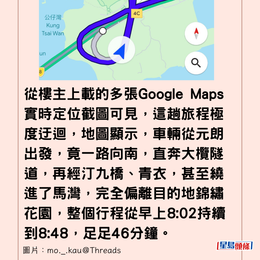 從樓主上載的多張Google Maps實時定位截圖可見,這趟旅程極度迂迴,地圖顯示,車輛從元朗出發,竟一路向南,直奔大欖隧道,再經汀九橋、青衣,甚至繞進了馬灣,完全偏離目的地錦繡花園,整個行程從早上8:02持續到8:48,足足46分鐘。