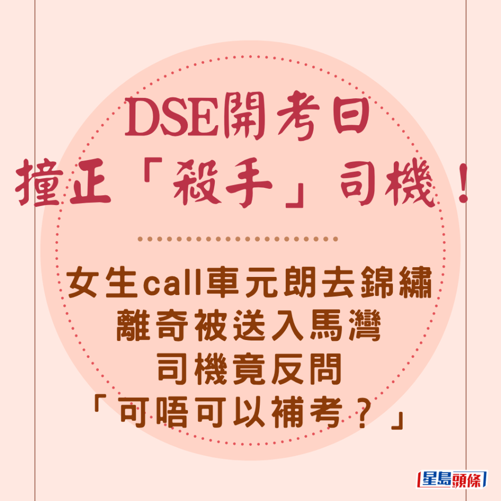DSE開考日撞正「殺手」司機!女生call車元朗去錦繡 離奇被送入馬灣 司機竟反問「可唔可以補考?」↓↓↓↓