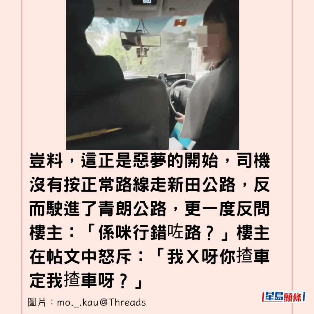 豈料,這正是惡夢的開始,司機沒有按正常路線走新田公路,反而駛進了青朗公路,更一度反問樓主:「係咪行錯咗路?」樓主在帖文中怒斥:「我X呀你揸車定我揸車呀?」