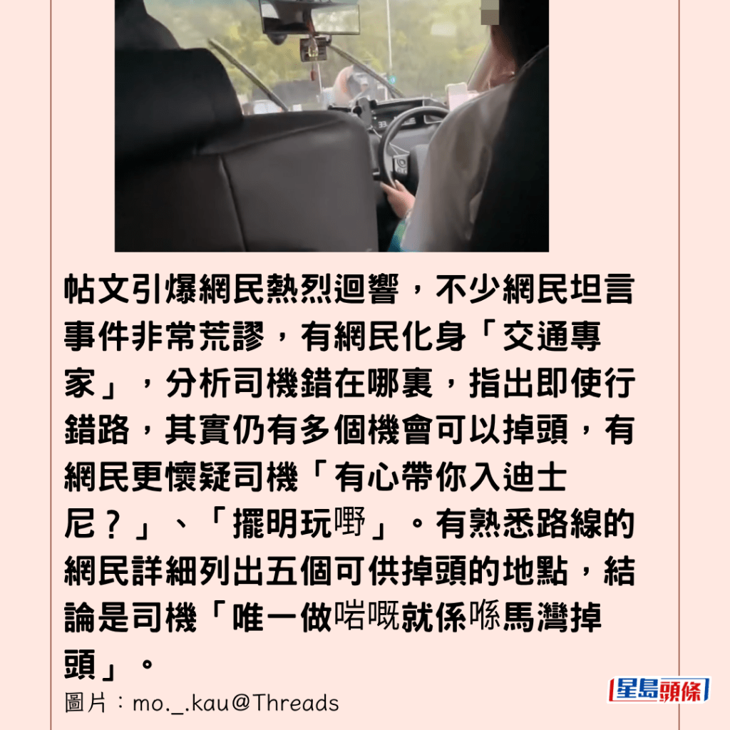 帖文引爆網民熱烈迴響,不少網民坦言事件非常荒謬,有網民化身「交通專家」,分析司機錯在哪裏,指出即使行錯路,其實仍有多個機會可以掉頭,有網民更懷疑司機「有心帶你入迪士尼?」、「擺明玩嘢」。有熟悉路線的網民詳細列出五個可供掉頭的地點,結論是司機「唯一做啱嘅就係喺馬灣掉頭」。