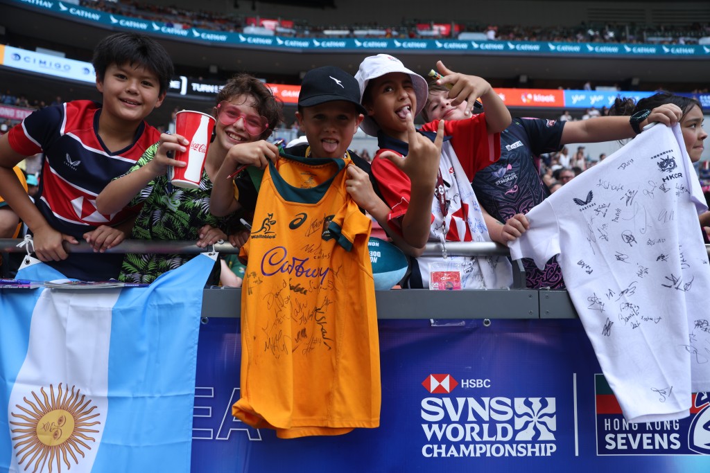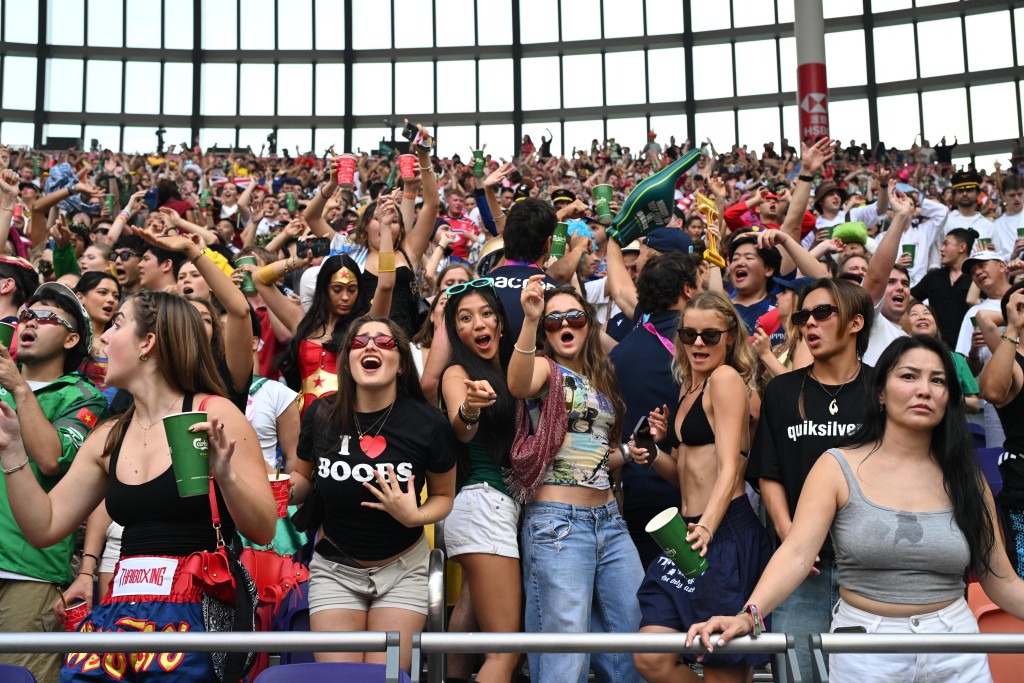 香港國際七人欖球賽今日(19日)進入最後一天,不少市民和遊客悉心打扮入場觀賽,有人裝扮成熊貓、恐龍等動物及各種卡通人物。現場亦有逾50名球迷排隊,等候進入較近中間草地的2號看台。
