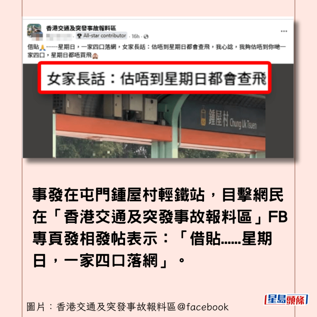 事發在屯門鍾屋村輕鐵站,目擊網民昨日(19日)在「香港交通及突發事故報料區」FB專頁發相發帖表示:「借貼……星期日,一家四口落網」。