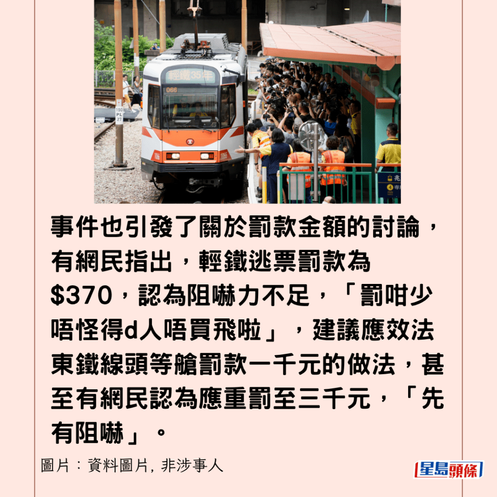 事件也引發了關於罰款金額的討論,有網民指出,輕鐵逃票罰款為$370,認為阻嚇力不足,「罰咁少唔怪得d人唔買飛啦」,建議應效法東鐵線頭等艙罰款一千元的做法,甚至有網民認為應重罰至三千元,「先有阻嚇」。