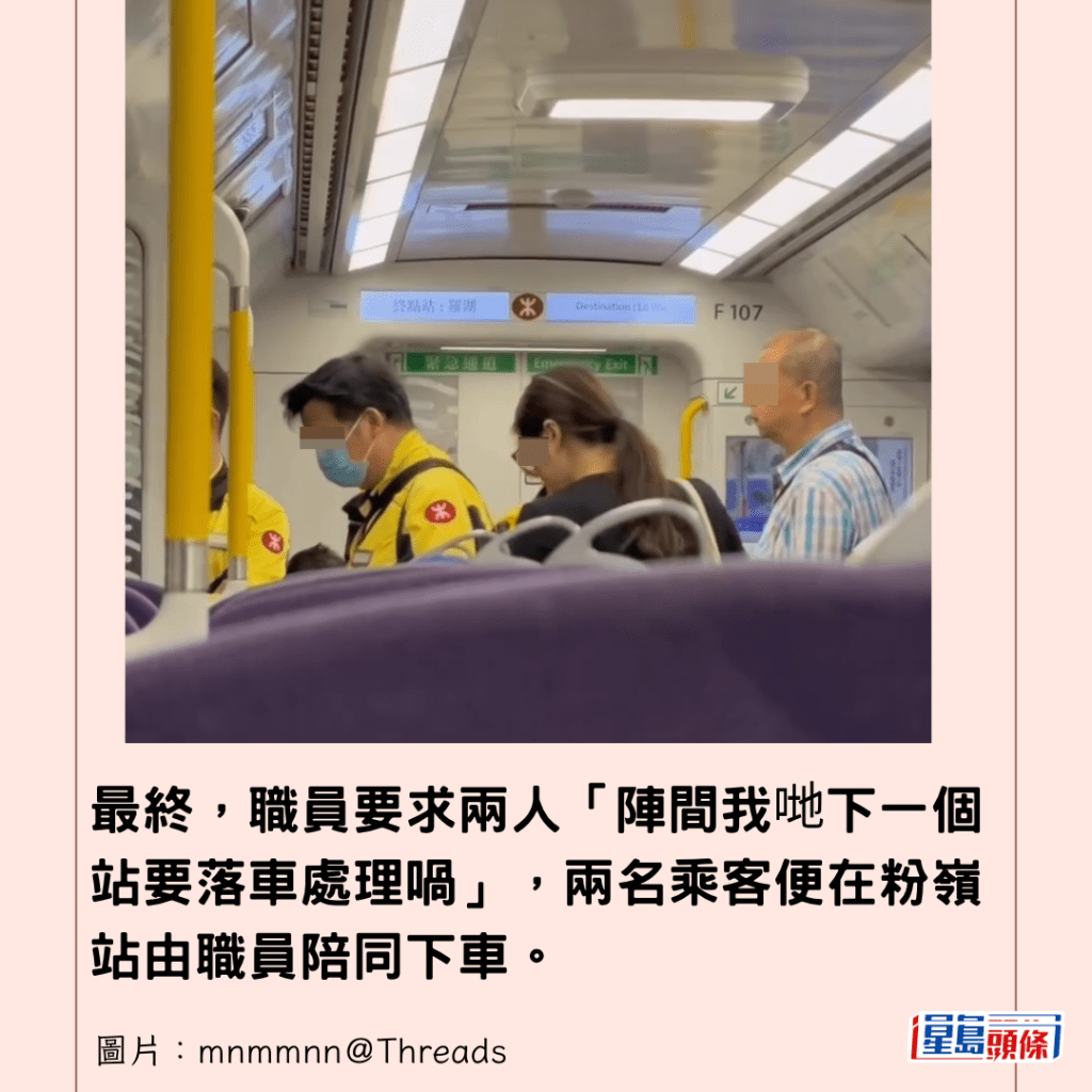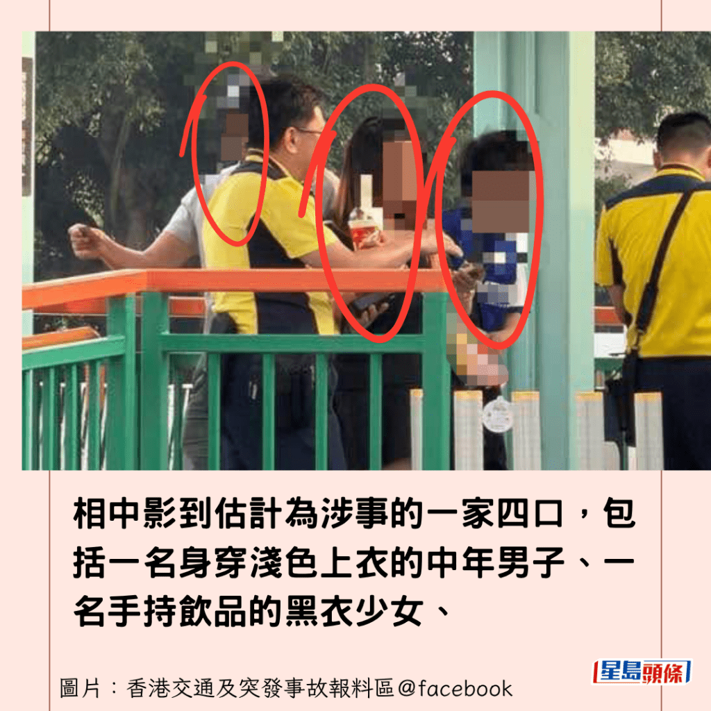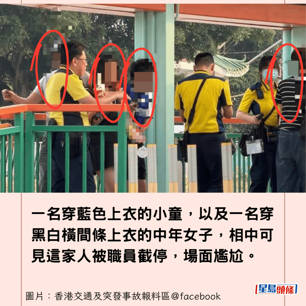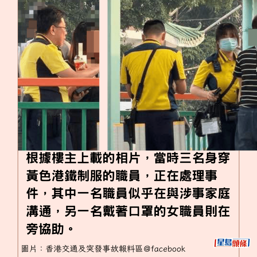 根據樓主上載的相片,當時三名身穿黃色港鐵制服的職員,正在處理事件,其中一名職員似乎在與涉事家庭溝通,另一名戴著口罩的女職員則在旁協助。
