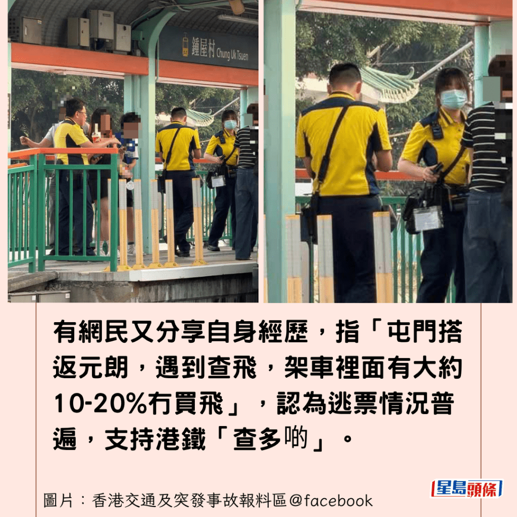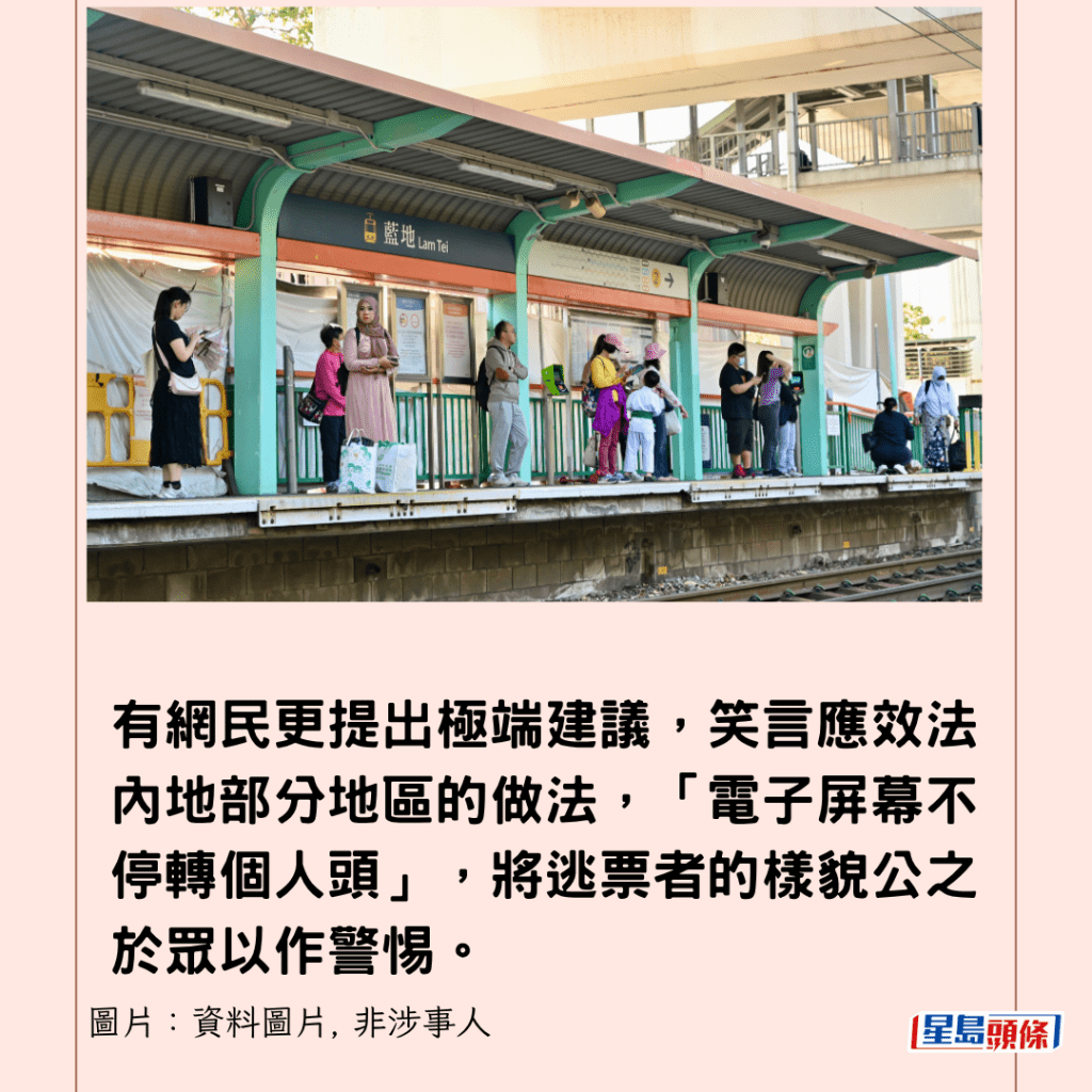 有網民又分享自身經歷,指「屯門搭返元朗,遇到查飛,架車裡面有大約10-20%冇買飛」,認為逃票情況普遍,支持港鐵「查多啲」。有網民更提出極端建議,笑言應效法內地部分地區的做法,「電子屏幕不停轉個人頭」,將逃票者的樣貌公之於眾以作警惕。