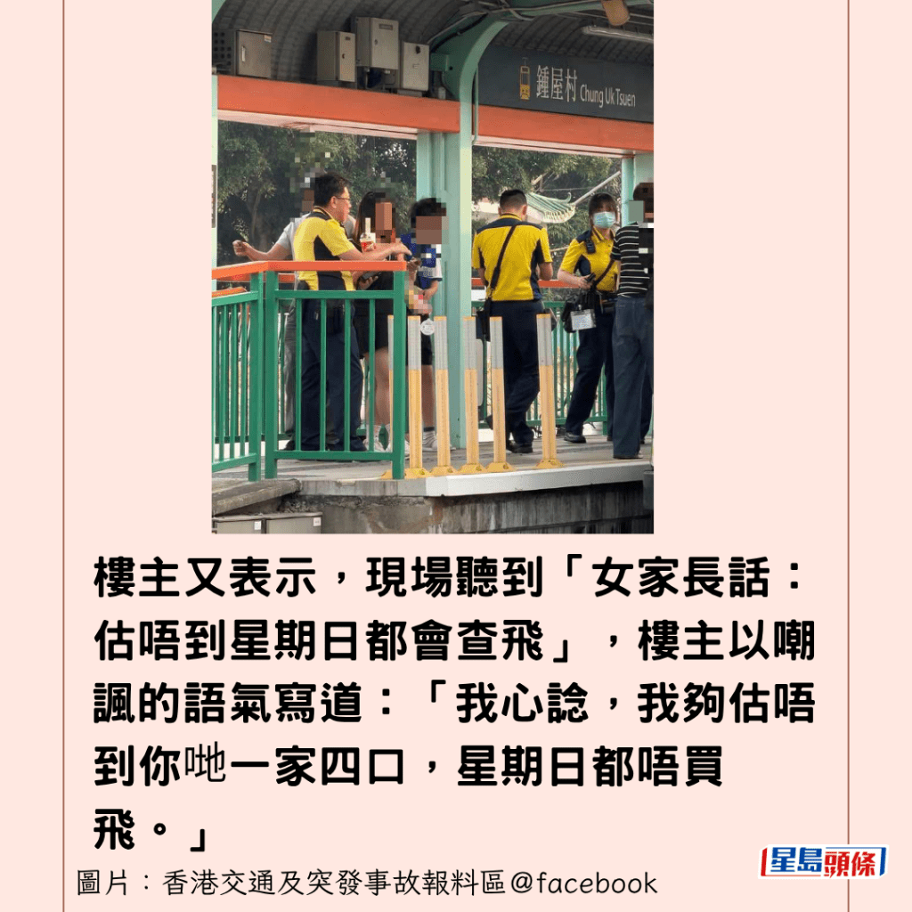 樓主又表示,現場聽到「女家長話:估唔到星期日都會查飛」,樓主以嘲諷的語氣寫道:「我心諗,我夠估唔到你哋一家四口,星期日都唔買飛。」