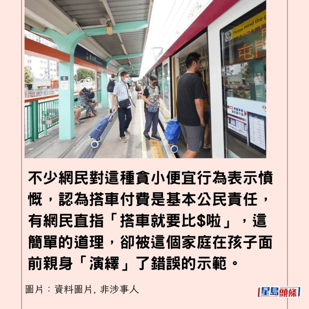 不少網民對這種貪小便宜行為表示憤慨,認為搭車付費是基本公民責任,有網民直指「搭車就要比$啦」,這簡單的道理,卻被這個家庭在孩子面前親身「演繹」了錯誤的示範。