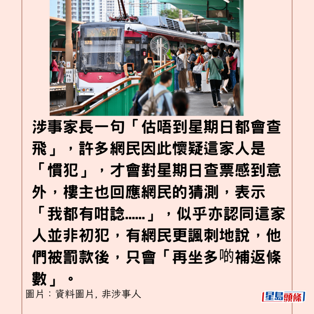 涉事家長一句「估唔到星期日都會查飛」,許多網民因此懷疑這家人是「慣犯」,才會對星期日查票感到意外,樓主也回應網民的猜測,表示「我都有咁諗……」,似乎亦認同這家人並非初犯,有網民更諷刺地說,他們被罰款後,只會「再坐多啲補返條數」。